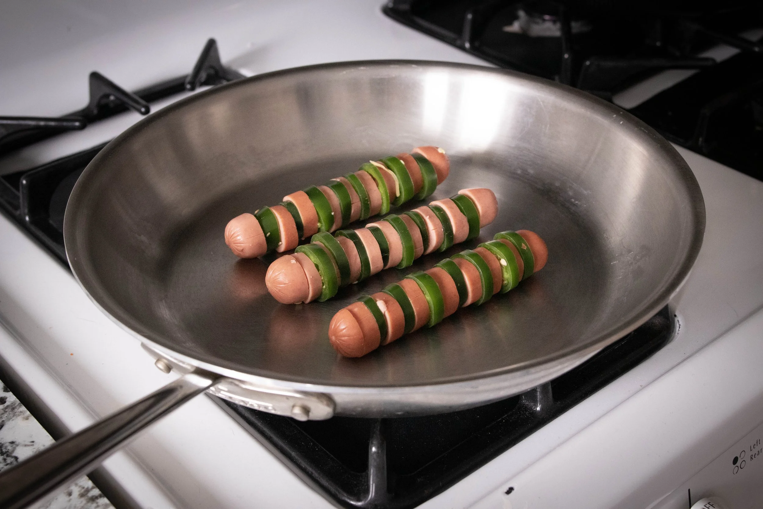 Next you’re going the thread the dogs & jalapeños over a Slim Jim. I even attached the ends for some chef-level shit.