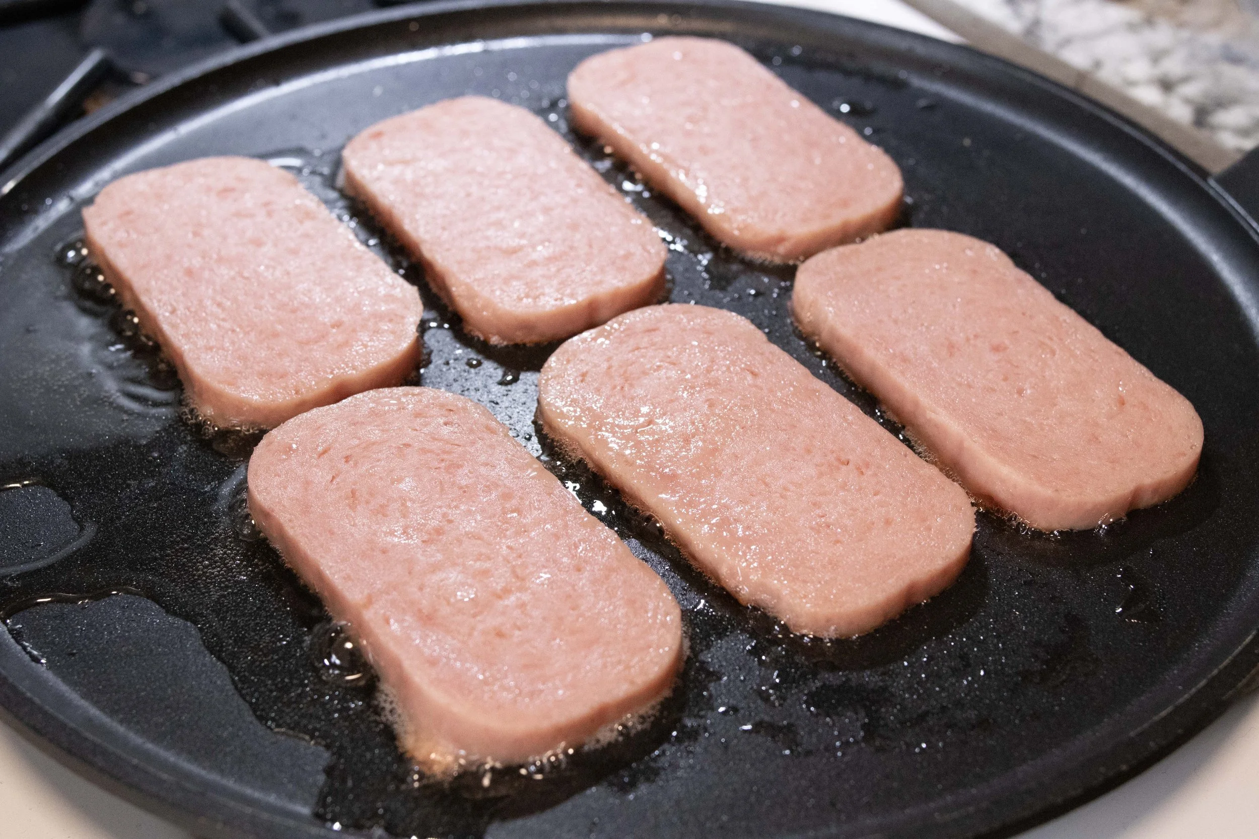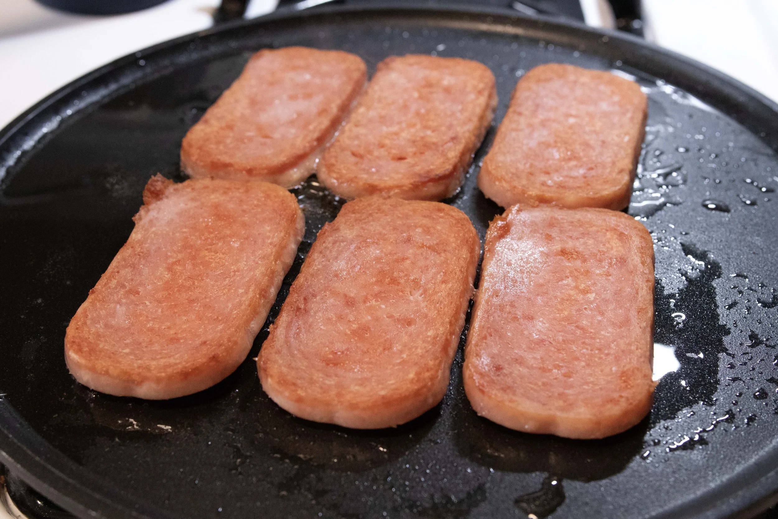 Slice the SPAM into 1/4” slices. As far as the SPAM itself goes there are a ton of flavors to choose from. I kept it classic because I’m a classy bitch. Pan fry the slices on each side until they look nice and crispy.