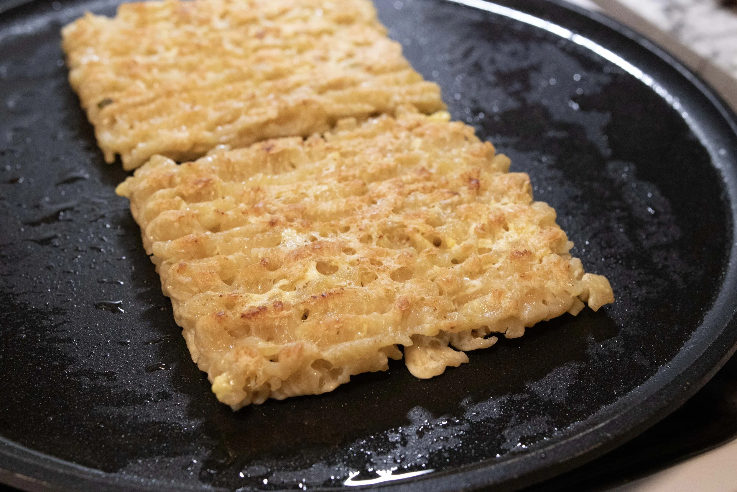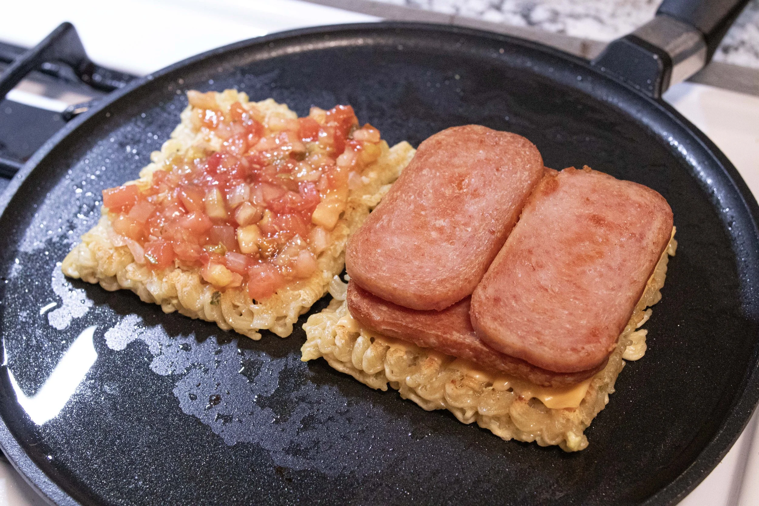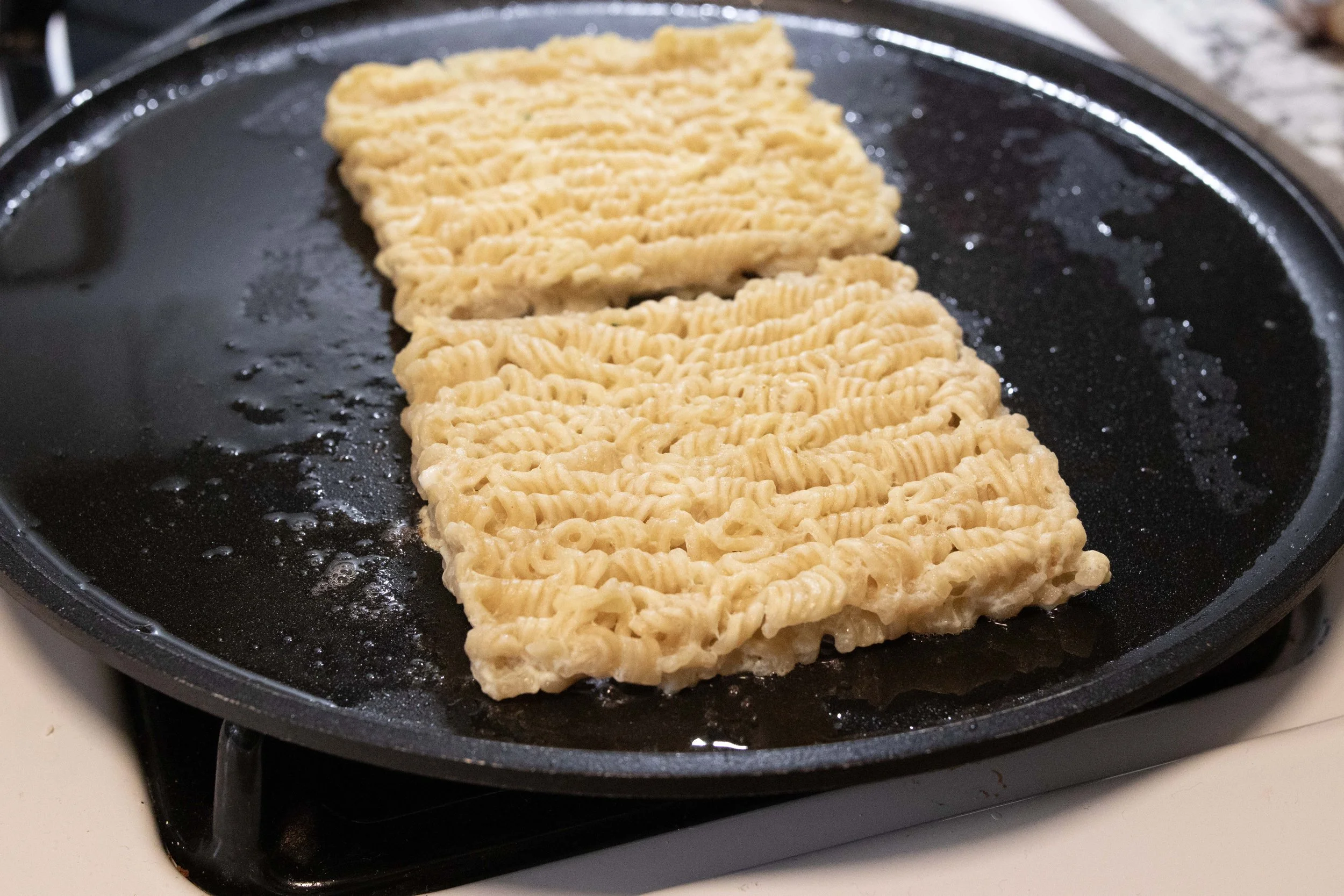 Crisp up your ramen bricks on a skillet. I cooked them on the same skillet that I cooked the SPAM on so I get all that delicious greasy flavor mixed in.