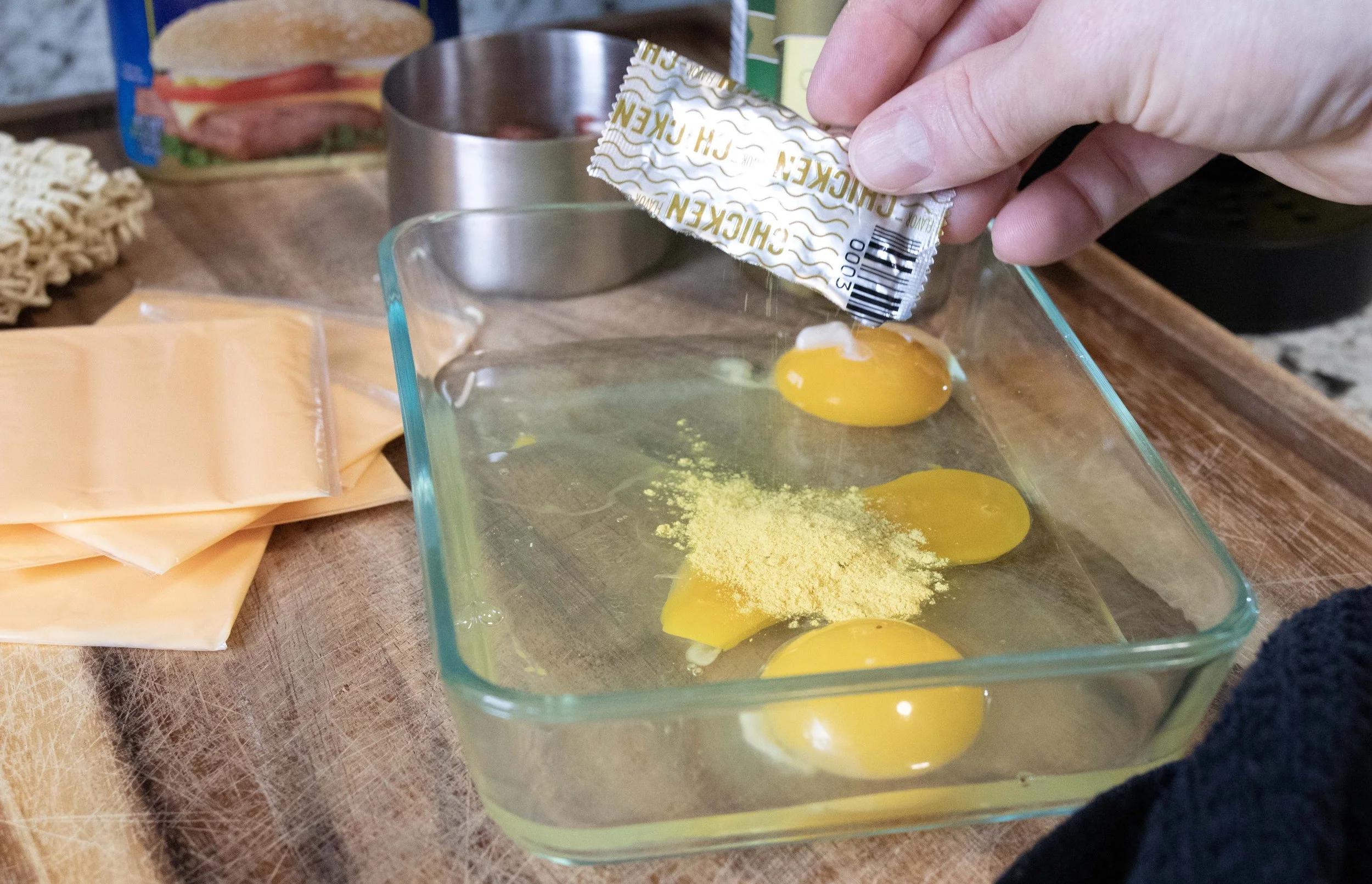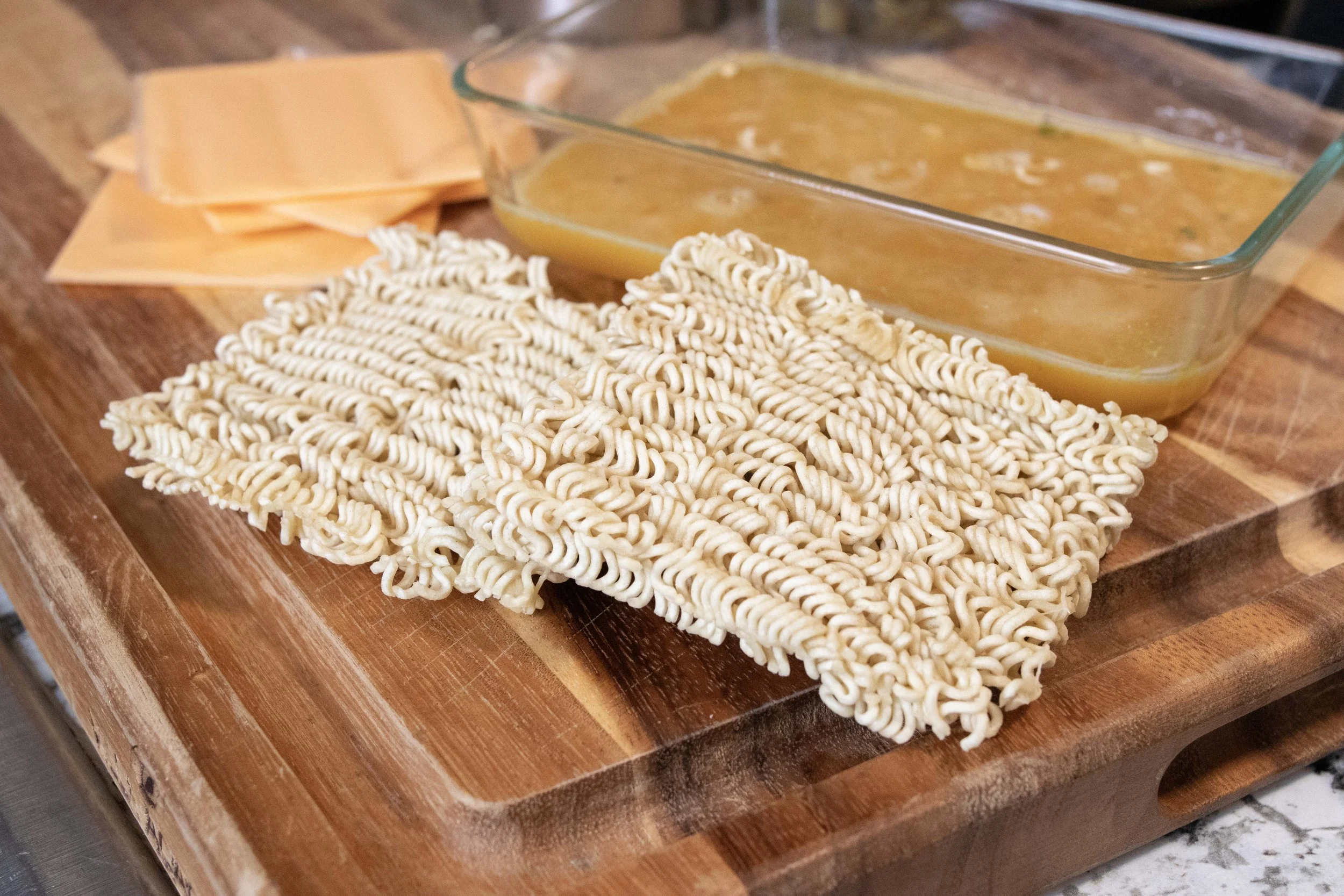 For the Ramen - you’re going to split that noodle brick so you end up with two bricks. Add the ramen seasoning pack to an egg wash mixture and soak the shit out of each of the bricks.